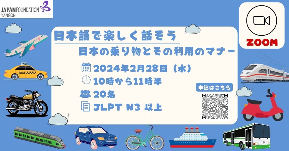 (日本語は下にあります) ဂျပန်ဖောင်ဒေးရှင်းရန်ကုန်ဂျပန်ယဉ်ကျေးမှုစင်တာသည် ဂျပန်ဘာသာစကားလေ့လာနေသူတွေအတွက် ဂျပန်နိုင်ငံရဲ့ ယဉ်ကျေးမှုနဲ့ဓလေ့ထုံးတမ်းစတာတွေကို ဂျပန်လူမျိုးနဲ့ ဂျပန်လို ပျော်ပျော်ရွှင်ရွှင် နှီးနှော ဖလှယ်နိုင်မယ့် “ဂျပန်လိုပျော်ပျော်ရွှင်ရွင် စကားပြောရအောင်” ဆိုတဲ့ အစီအစဉ်လေးကို ပြုလုပ်ပေးလျက်ရှိပါတယ်။...