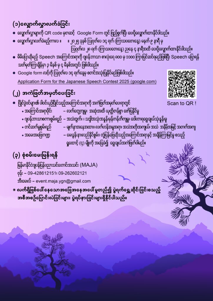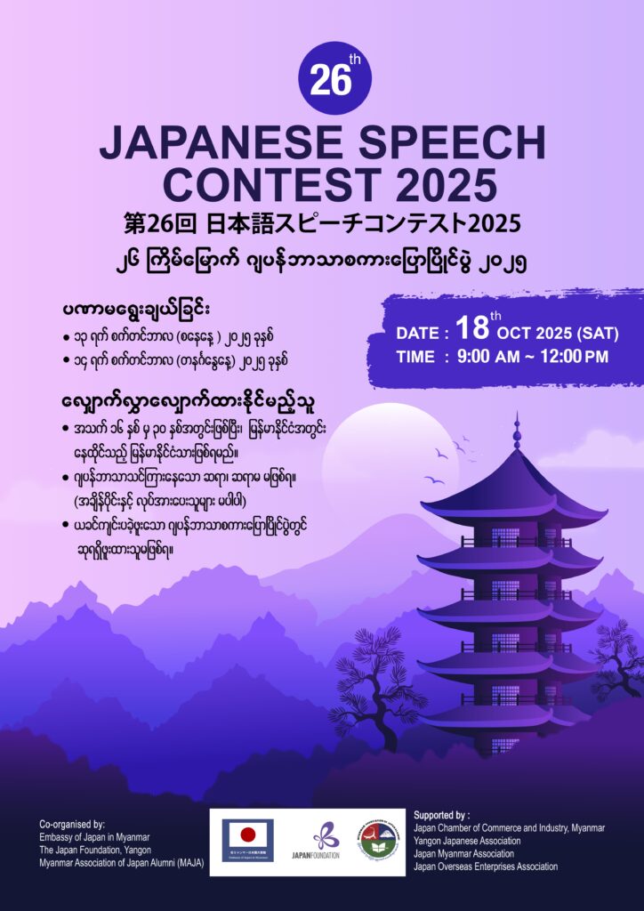 ၂၆ ကြိမ်မြောက် ဂျပန်ဘာသာစကားပြောပြိုင်ပွဲကို ၂၀၂၅ ခုနှစ် အောက်တိုဘာလ ၁၈ ရက် (စနေနေ့) တွင် ပြုလုပ်ကျင်းပသွားမည်ဖြစ်ပါသည်။ စိတ်ပါဝင်စားသူများ အောက်ပါအချက်အလက်များကို ဖတ်ရှု၍ ပါဝင်ယှဉ်ပြိုင်နိုင်ပါသည်။