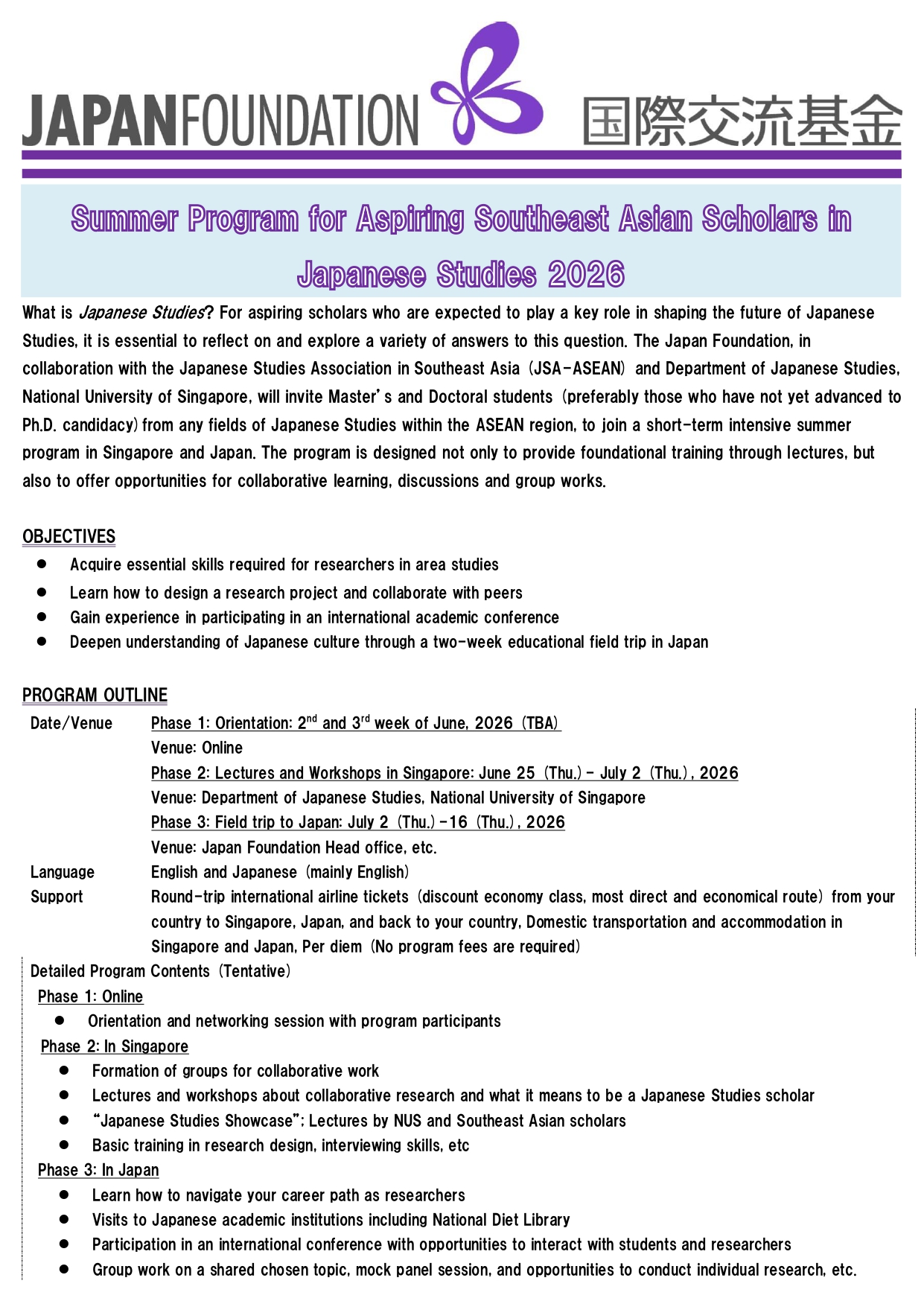 Venue: Online Phase 2: Lectures and Workshops in Singapore: June 25 (Thu.)- July 2 (Thu.), 2026 Venue: Department of Japanese Studies, National University of Singapore Phase 3: Field trip to Japan: July 2 (Thu.)-16 (Thu.), 2026 Venue: Japan Foundation Head office, etc. |