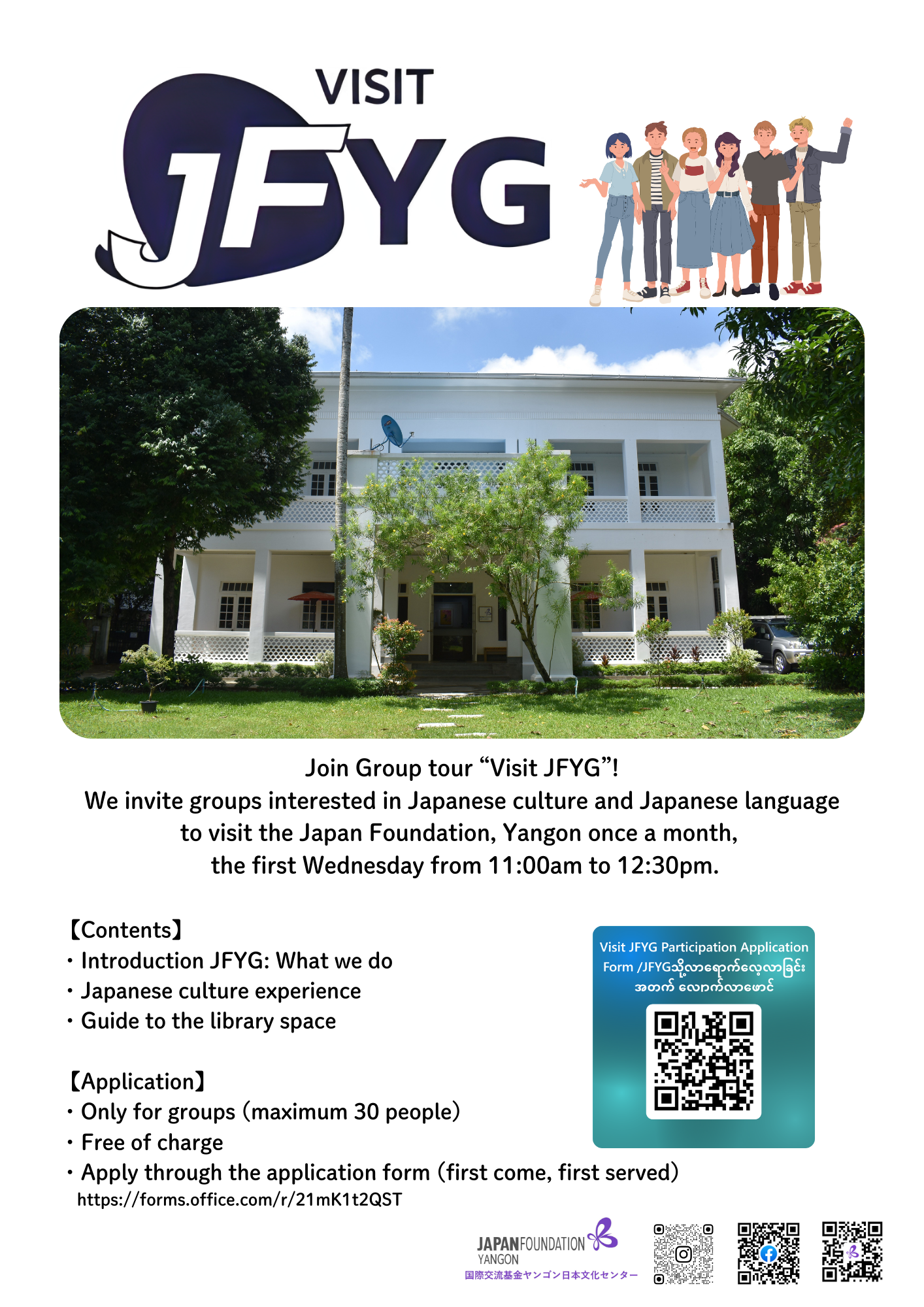 We the Japan Foundation, Yangon (JFYG) host a free monthly group tour, “Visit JFYG”, on the first Wednesday of each month to share our activities and introduce Japanese culture.